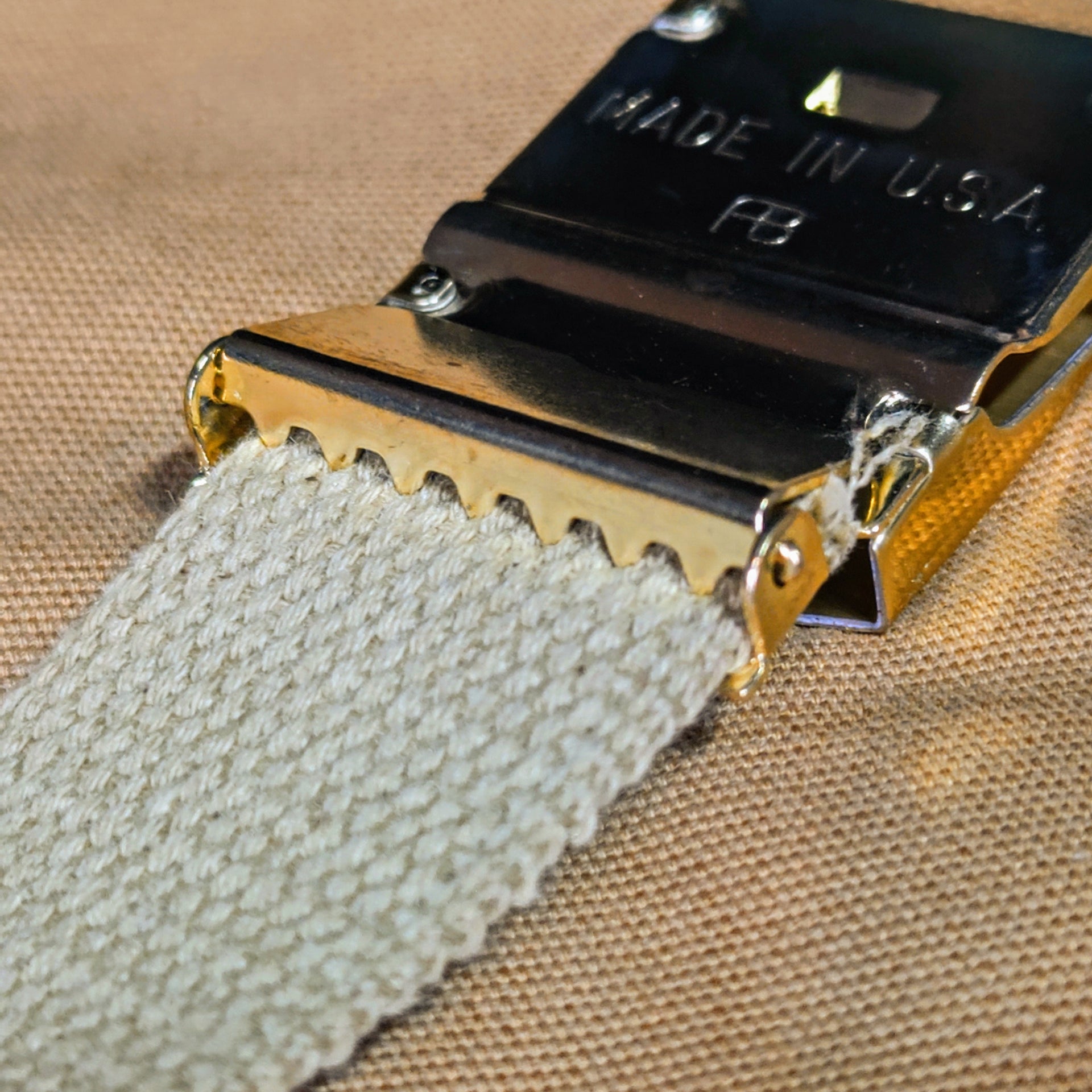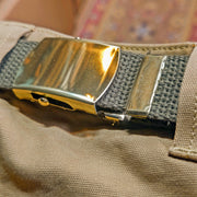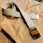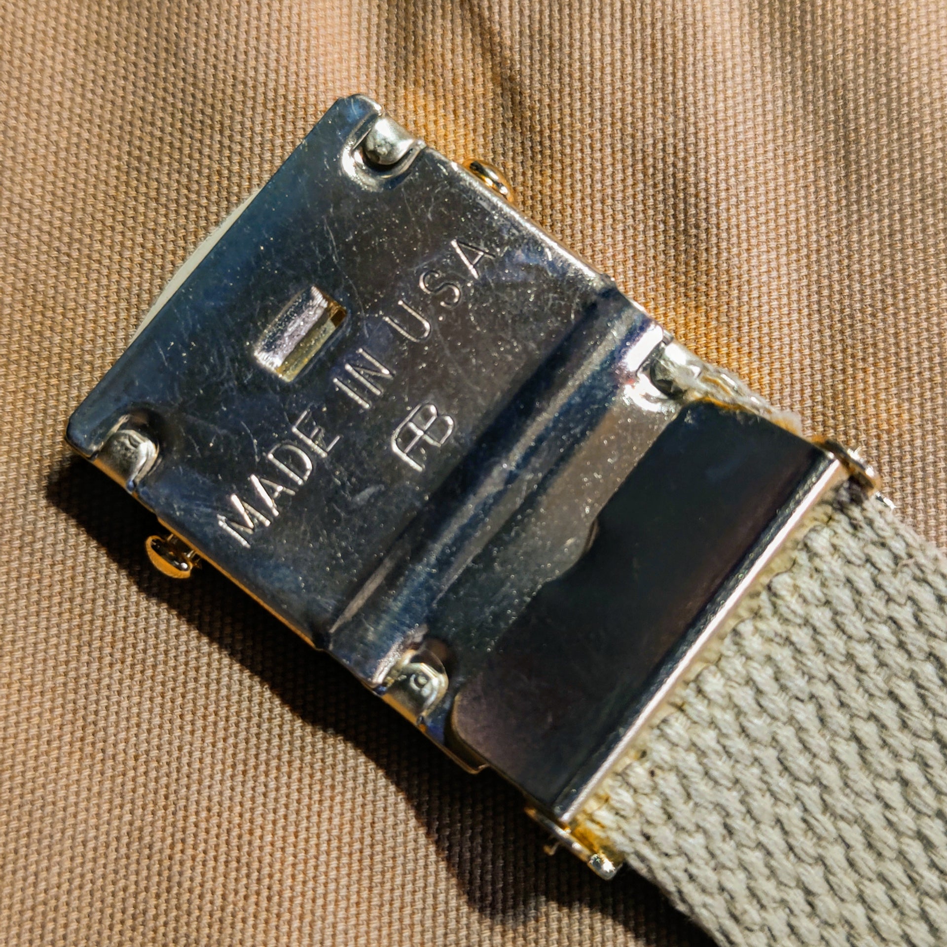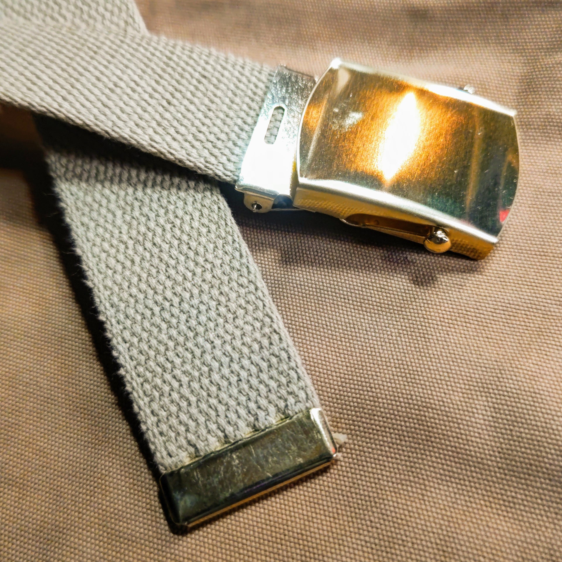陸軍由来の G.I. = government issue ベルト。アメリカ国内では陸軍を始め、民間の運輸会社でも実用的に使用されております。日本では90年代に主にストリートカルチャーで大流行し、昔懐かしい " ガチャベルト " の呼び名でお馴染みのベルトでありました。本品は当時から現代に至るまで、クオリティを変えることなく made in U.S.A. のまま生産され続けている貴重な一品。何よりこの手では珍しい 真鍮バックル & チップ も嬉しいポイント。任意のポジションで簡単に ロック & アンロック ができ、帯の長さもハサミなどで自在にカットができるのでとても便利。リーズナブルなお値段で入手できるのも尚良しです。街使いからアウトドアまで幅広くお使いいただける一本、よろしくお願いします。