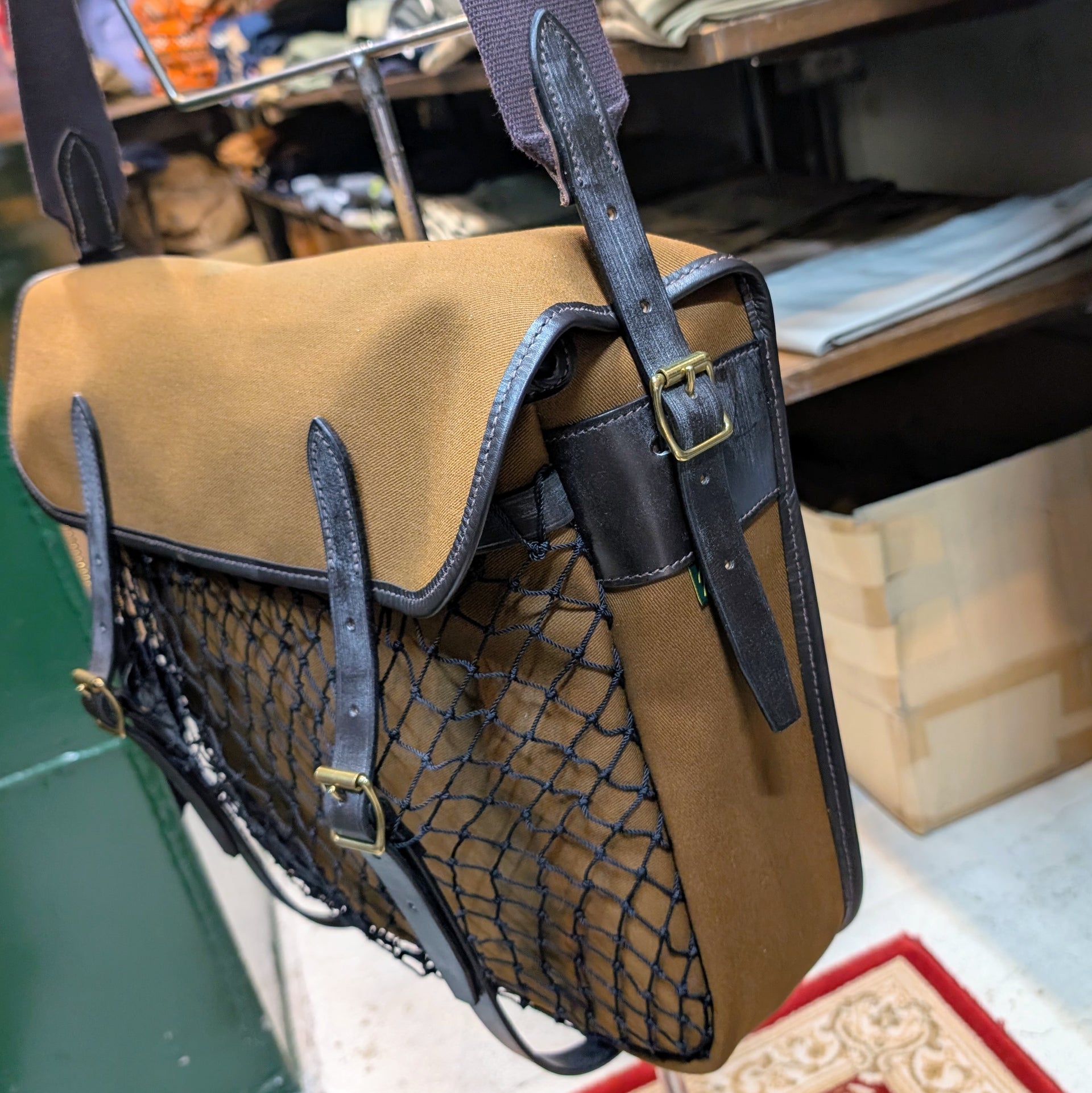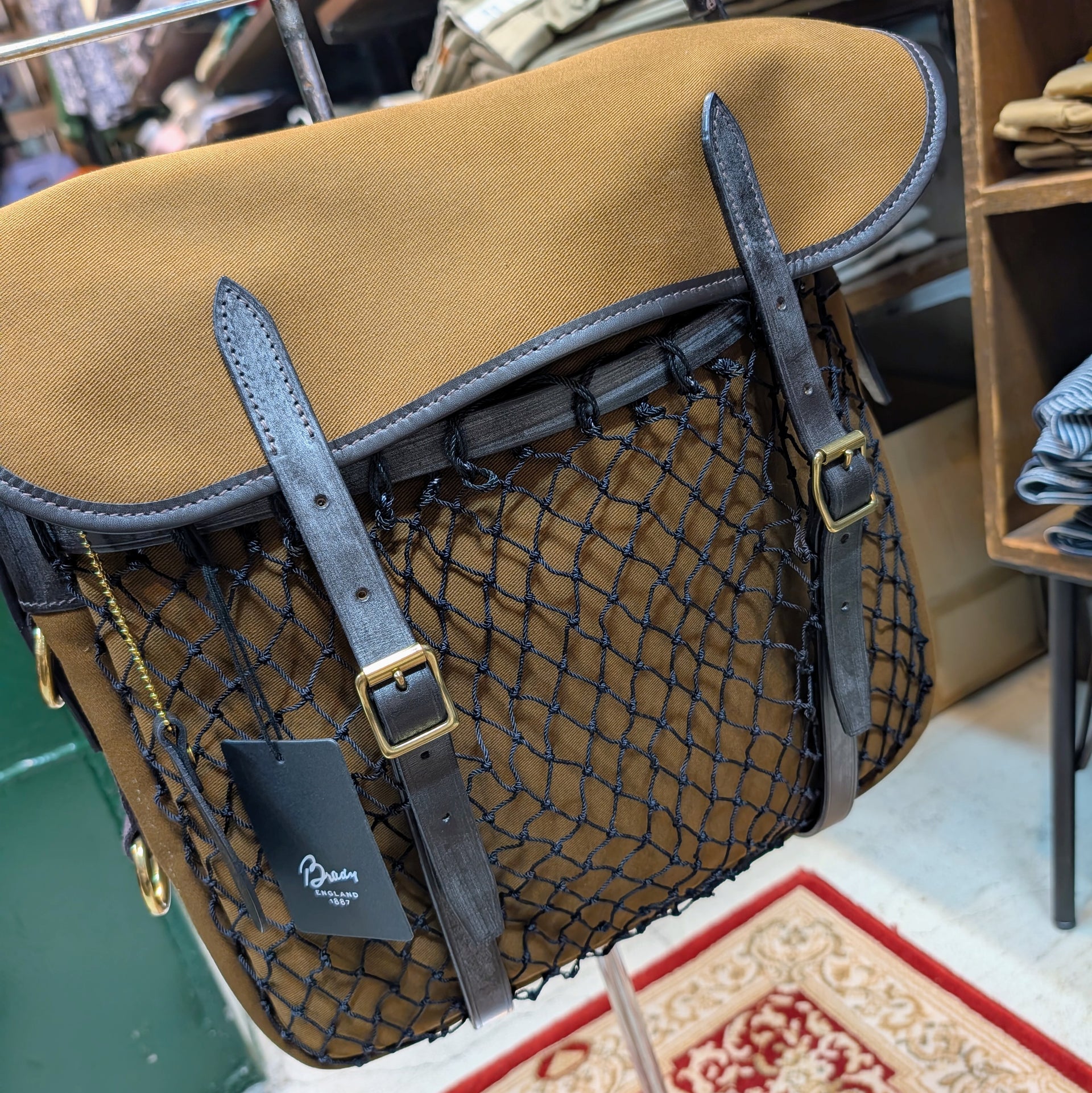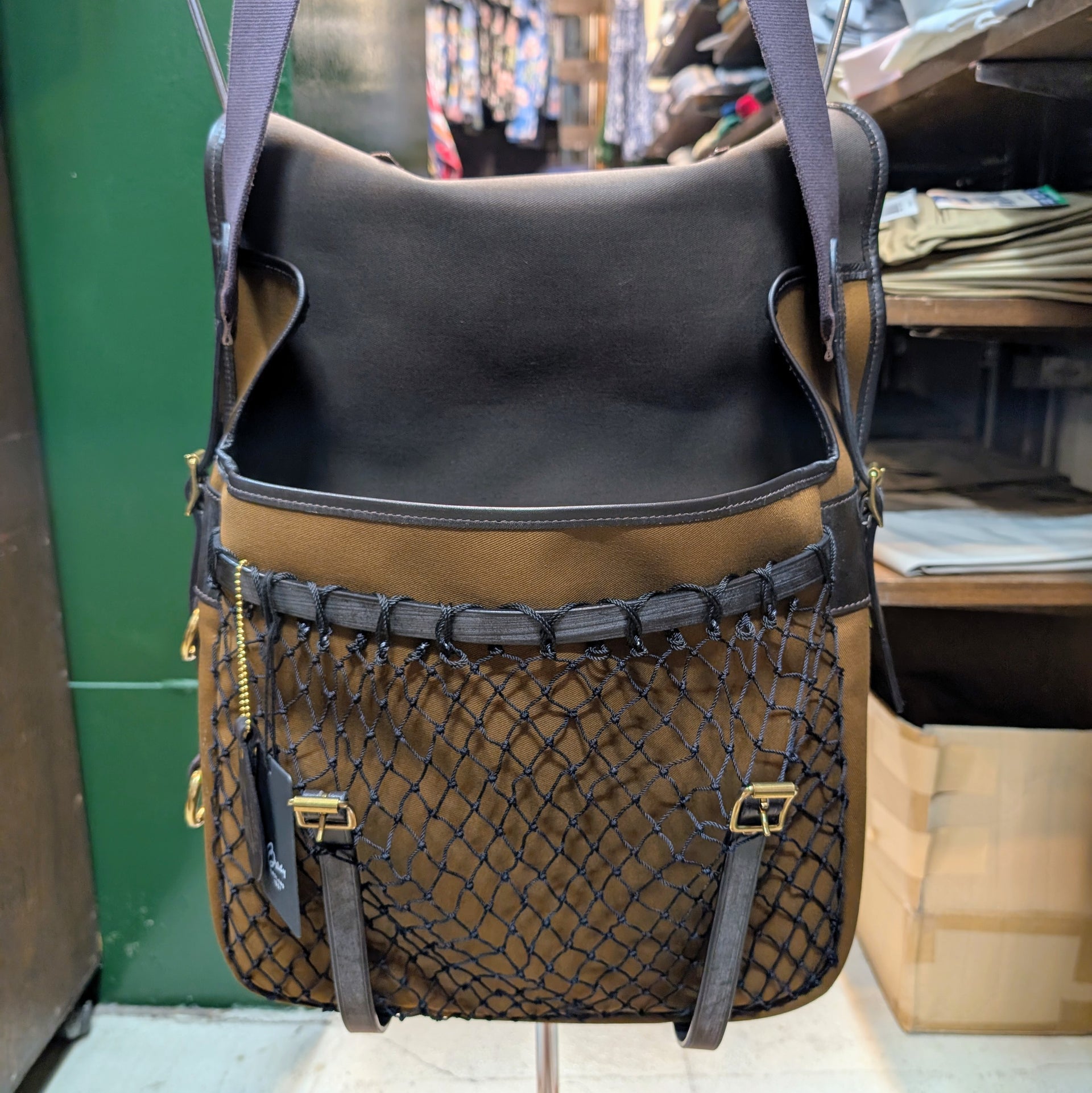 英国製、Brady 社の看板製品のひとつである " Wye " 。古くよりフィッシングなどの game bag として使用されていた典型的な箱型のクラシック仕様。今日にいたるまで made in ENGLAND で製造され続けている歴史的なモデルとなります。 Brady 社製品ではアイコンと言っても過言ではない本体ツイル生地には1893年創業、イタリア国のリモンタ社製の撥水性・防汚性のある " drill drop " 生地を採用。( ※ リモンタ社は主に高品質なナイロン生地製造を得意とする老舗メーカー。その色合いと発色性豊かな生地には定評があり今日に至るまでに様々なラグジュアリーブランドなどが挙ってリモンタ社製のナイロン生地を採用するように成っております。 )また英国内製造の耐久性・撥水性の高いロウ引き加工がなされるブライドルレザー、そして馬鞍などにも使用される耐久力・安全性にも長けている高品質で風情のある真鍮製金具、ミリタリースペックでもある綿100%を使用した耐久性のある肩掛ストラップも Brady 社製品では代表的な物で必要不可欠な構成パーツであります。構造は英国製バッグらしい素朴でシンプルなつくり。メイン収納はA4ファイルが縦・横ともに十分に収まるやや大きめの収納。成人男性であれば一泊程度の旅行にお使いできそうな大きさでございます。そのメイン収納を上部から覆うかたちでフラップが施され、フラップ先端にはバックル留め仕様のブライドルレザー strap が前面左右に二カ所、縫い付けられております。また特徴的な前面には綿製のネットが縫い付けられており元来、フィッシングなどの獲物を傷つけないように持ち帰るために使用されていた名残り -。その象徴的なデザインを好まれて、こちらのバッグを選ばれるオーナーさまもおられます。近年ではそれぞれのライフスタイルに合わせ、小物や書物などの収納スペースとしてご使用されております。また、バッグ本体片横に備え付けられている二個一組の真鍮製リングは本来、フィッシング用の玉網を掛けておく物であり今日でも多くの釣り人が実際に使用しているパーツになります。元来のフィッシング bag だけの用途にとらわれず、時代を超えて様々な生活様式のニーズに応えるバッグとして永年生き続けている Wye 。ドリル・ドロップ生地とブライドルレザー、真鍮金具が織りなす素朴かつ伝統的な物こそ、英国らしいのスポーツ bag と言った処。時代に左右されない至高の逸品をぜひ貴方の手に -。