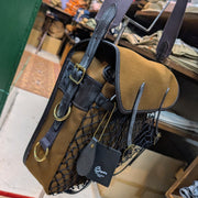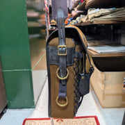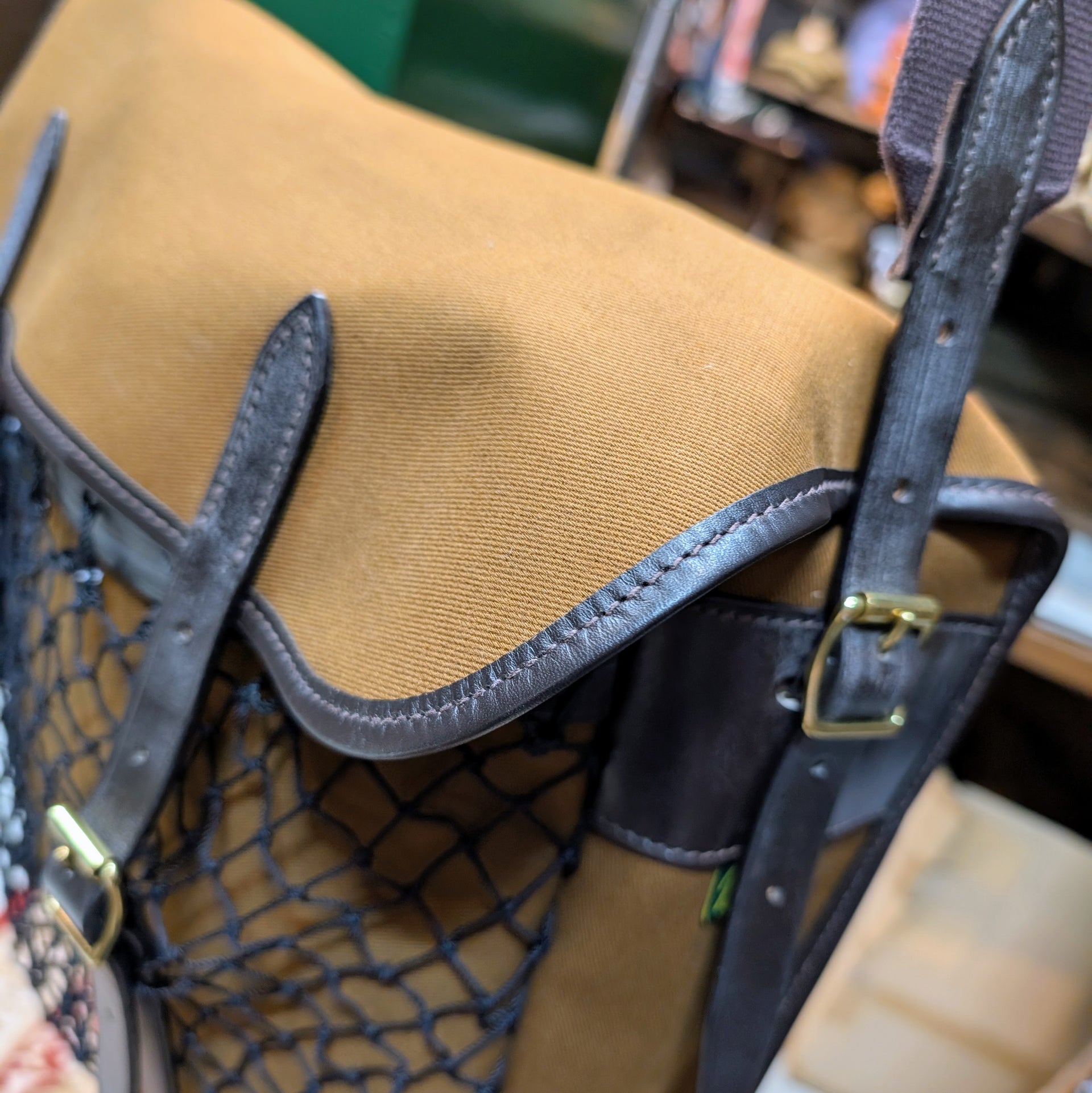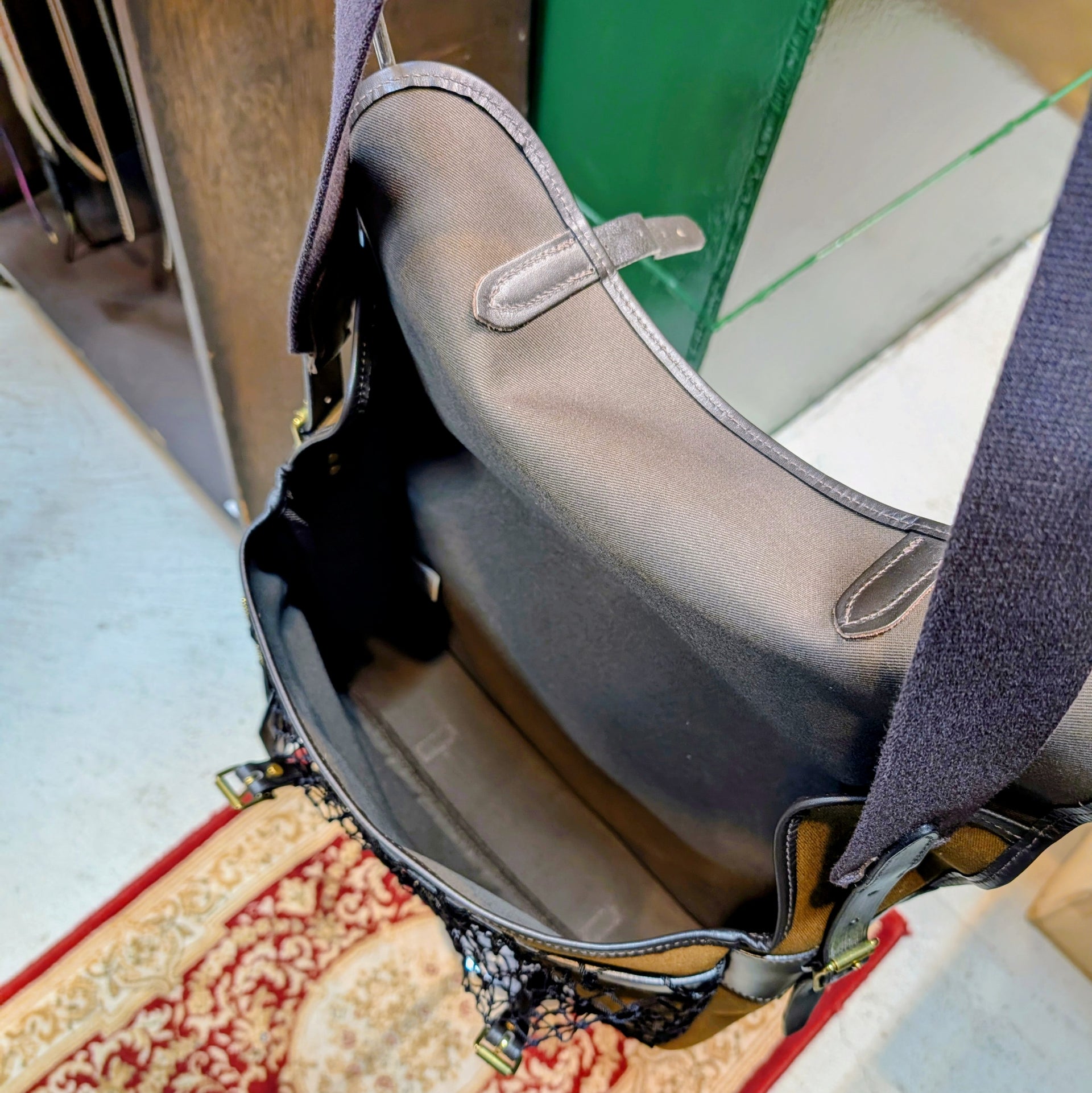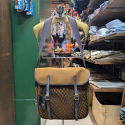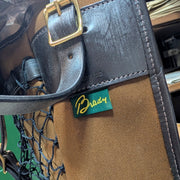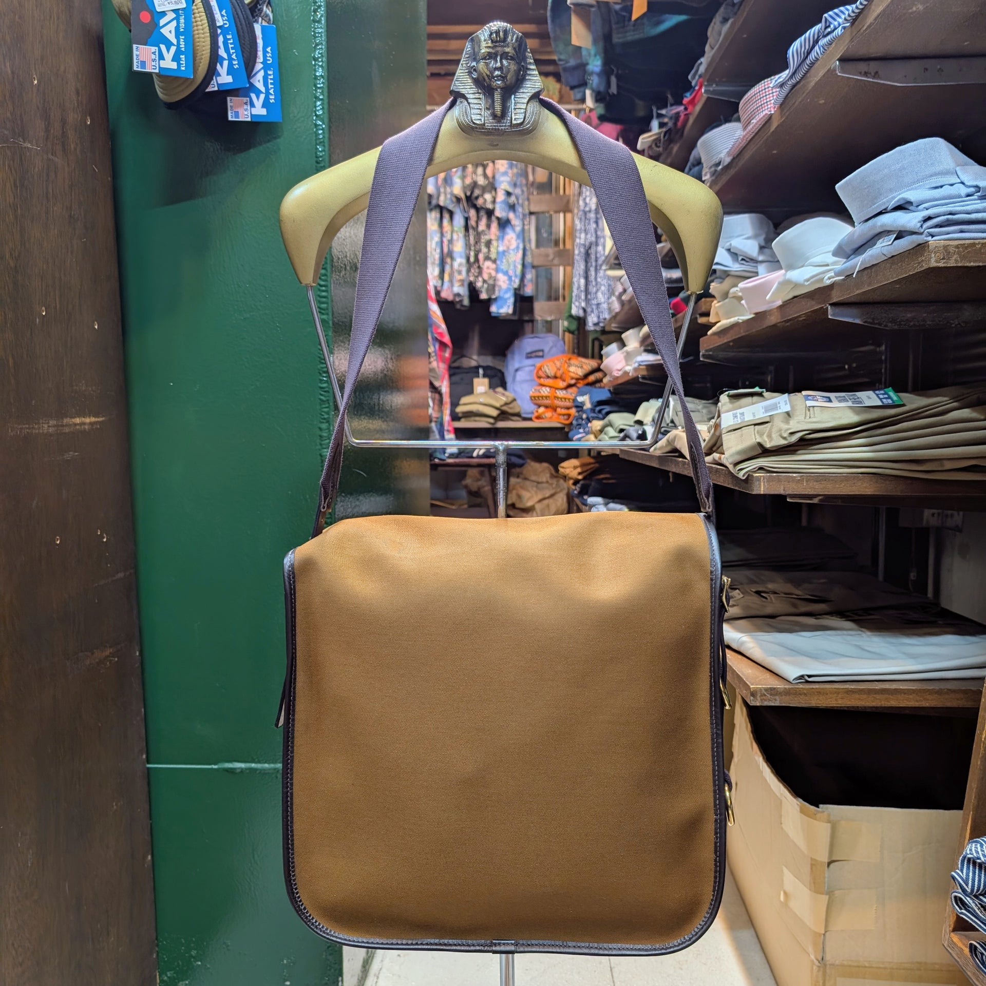 英国製、Brady 社の看板製品のひとつである " Wye " 。古くよりフィッシングなどの game bag として使用されていた典型的な箱型のクラシック仕様。今日にいたるまで made in ENGLAND で製造され続けている歴史的なモデルとなります。 Brady 社製品ではアイコンと言っても過言ではない本体ツイル生地には1893年創業、イタリア国のリモンタ社製の撥水性・防汚性のある " drill drop " 生地を採用。( ※ リモンタ社は主に高品質なナイロン生地製造を得意とする老舗メーカー。その色合いと発色性豊かな生地には定評があり今日に至るまでに様々なラグジュアリーブランドなどが挙ってリモンタ社製のナイロン生地を採用するように成っております。 )また英国内製造の耐久性・撥水性の高いロウ引き加工がなされるブライドルレザー、そして馬鞍などにも使用される耐久力・安全性にも長けている高品質で風情のある真鍮製金具、ミリタリースペックでもある綿100%を使用した耐久性のある肩掛ストラップも Brady 社製品では代表的な物で必要不可欠な構成パーツであります。構造は英国製バッグらしい素朴でシンプルなつくり。メイン収納はA4ファイルが縦・横ともに十分に収まるやや大きめの収納。成人男性であれば一泊程度の旅行にお使いできそうな大きさでございます。そのメイン収納を上部から覆うかたちでフラップが施され、フラップ先端にはバックル留め仕様のブライドルレザー strap が前面左右に二カ所、縫い付けられております。また特徴的な前面には綿製のネットが縫い付けられており元来、フィッシングなどの獲物を傷つけないように持ち帰るために使用されていた名残り -。その象徴的なデザインを好まれて、こちらのバッグを選ばれるオーナーさまもおられます。近年ではそれぞれのライフスタイルに合わせ、小物や書物などの収納スペースとしてご使用されております。また、バッグ本体片横に備え付けられている二個一組の真鍮製リングは本来、フィッシング用の玉網を掛けておく物であり今日でも多くの釣り人が実際に使用しているパーツになります。元来のフィッシング bag だけの用途にとらわれず、時代を超えて様々な生活様式のニーズに応えるバッグとして永年生き続けている Wye 。ドリル・ドロップ生地とブライドルレザー、真鍮金具が織りなす素朴かつ伝統的な物こそ、英国らしいのスポーツ bag と言った処。時代に左右されない至高の逸品をぜひ貴方の手に -。