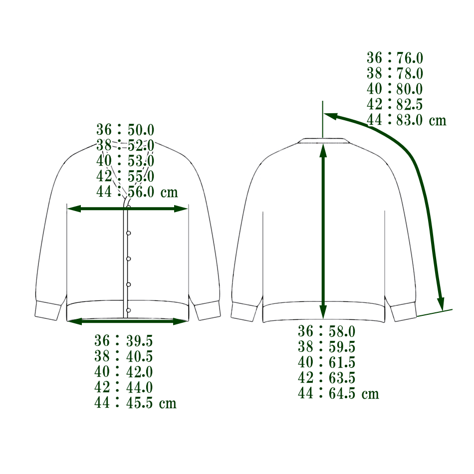 - 当メーカーの全商品、サイズが1~2サイズ小さめです。普段日本規格のMサイズを着用でしたら 40(L) ~ 42(XL) のサイズをお選びいただくか、現在お持ちのカーディガンの寸法を測った上でサイズを選ばれることを推奨いたします。