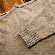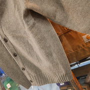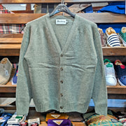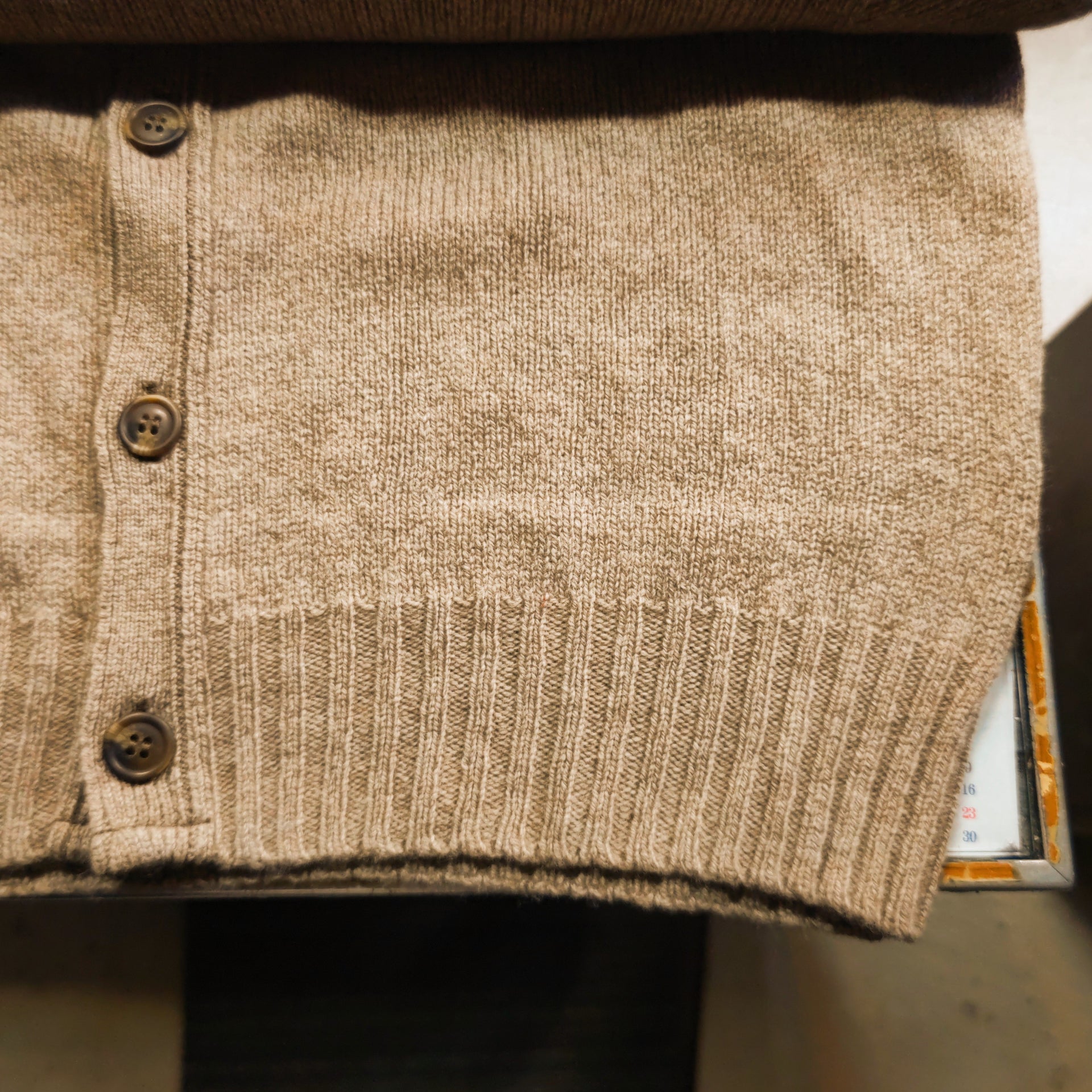 本品は数あるラムズウール(子羊毛)の中でも最高峰とされているオーストラリア「 ジーロン地域 」で育てられた純血種の子羊毛を用いたカーディガンとなります。ジーロンラムズ wool の特徴は何といってもその羊毛一本一本の繊維が他の品種と比べ、より細くしなやかな物となります。それにより保温性はさることながら " 柔らかい " " 軽い " が何よりの特徴として高級衣料界隈では特に重宝されている羊毛素材となっております。さらにシームレスニッティング=輪編みの技術によって縫合部分を極限にまで継ぎ目のない状態に仕上げております。生活の中でごろつきがちなセーター衣料によるストレスを軽減してくれるので冬場での重ね着の際、よりスムーズな着脱を実現してくれます。素朴で昔ながらの物ではあるが今日あまり見かけなくなったこの手のカーディガン。デスクワークや部屋着などに、、またはドライビングや外出の際にさっと羽織っていただけたらと思います。