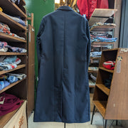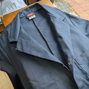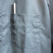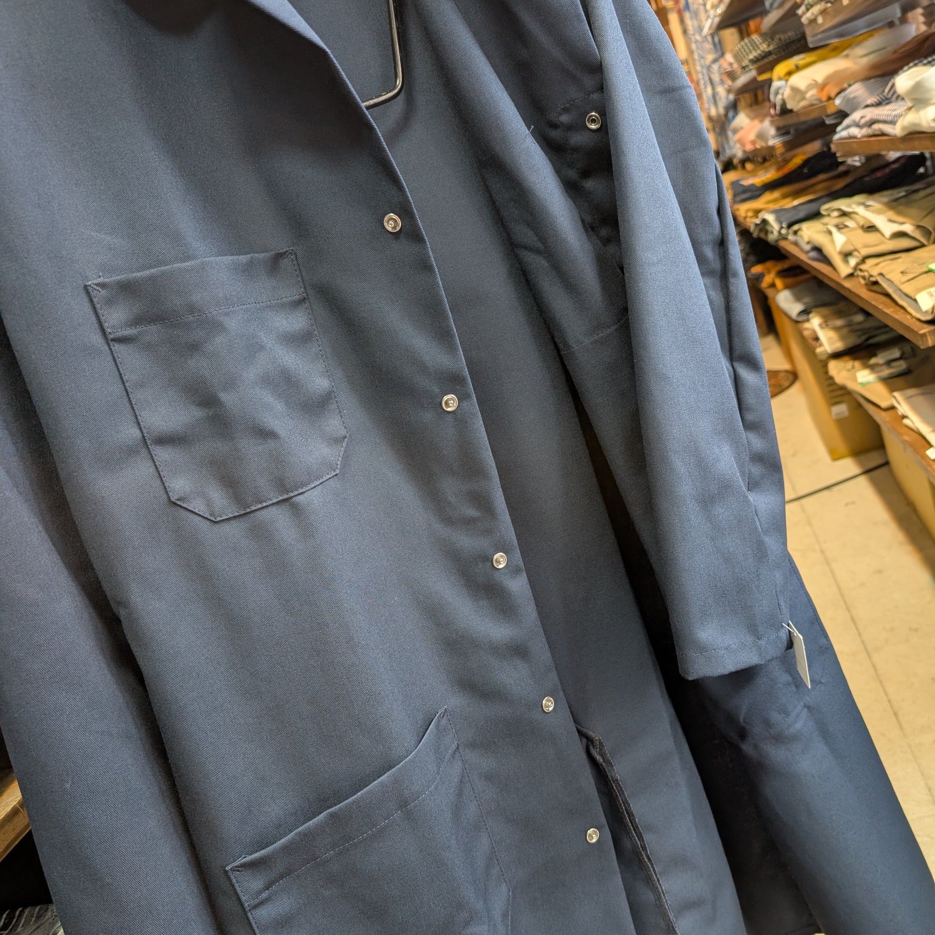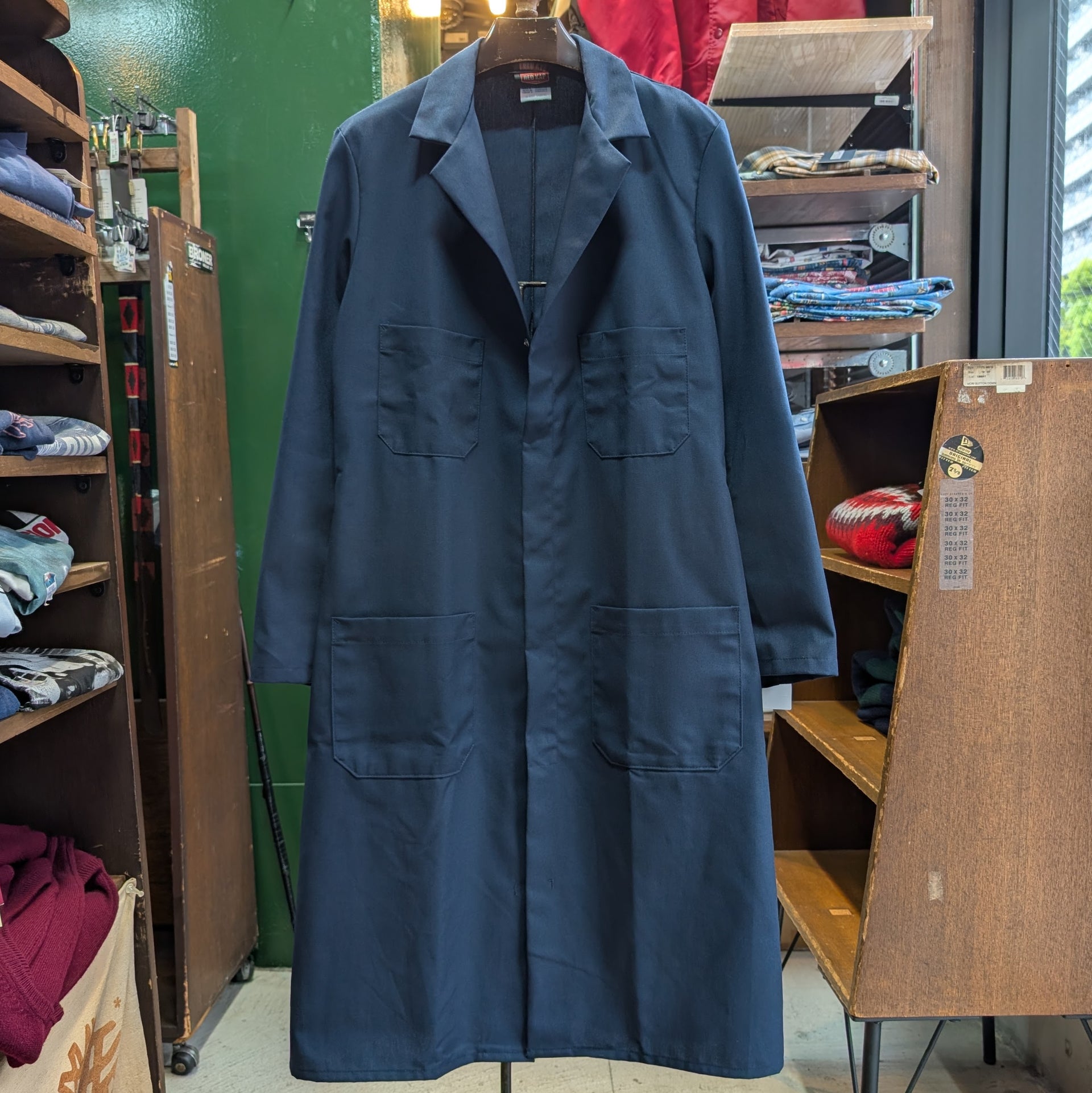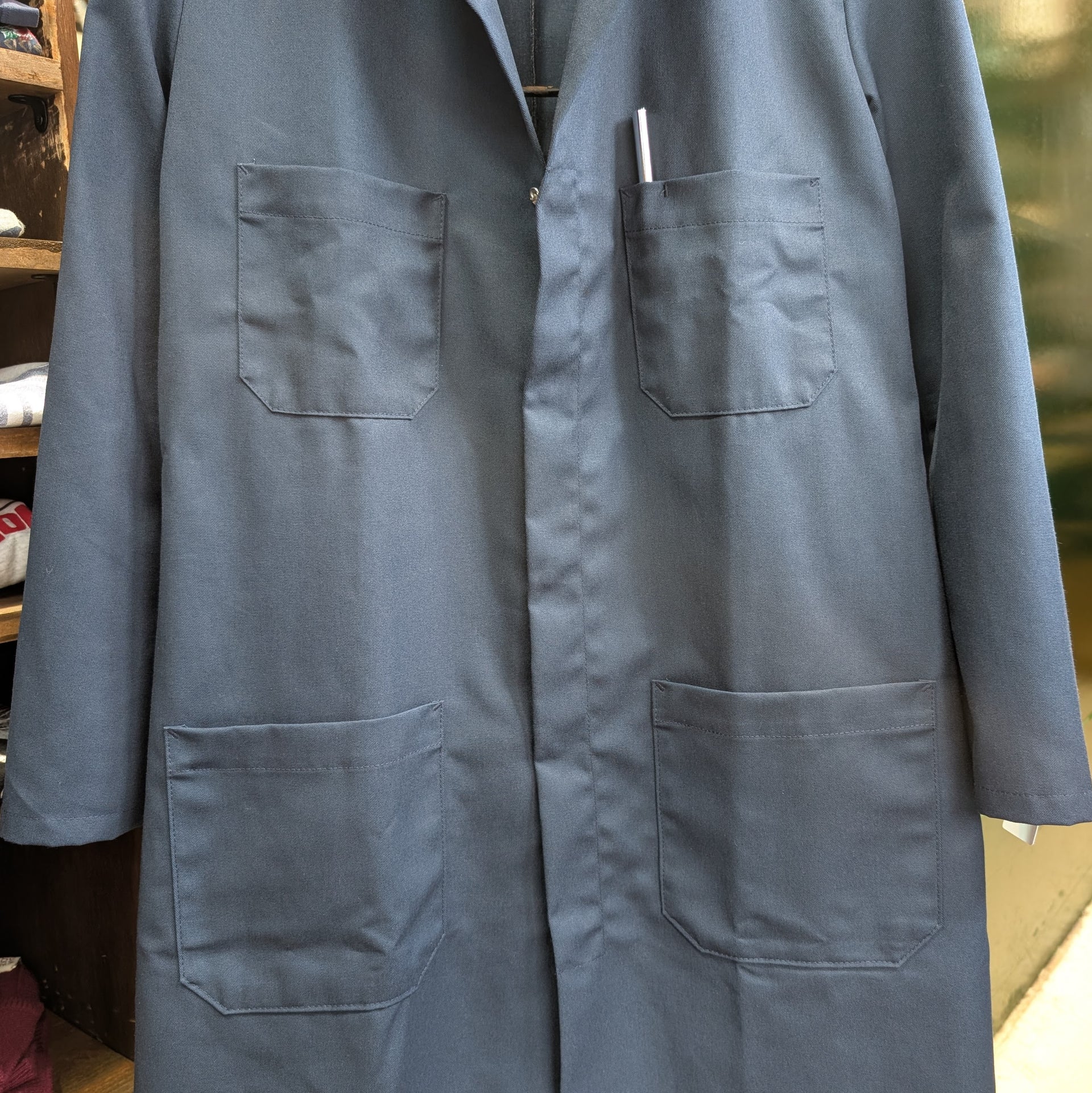 ショップ・コート。別名エンジニア・コートとも呼ばれ、その歴史は1930年代まで遡ります。主に技術者・整備士の制服として着用されたのが始まりとされており、現場への来客があった際に汚れを隠すためにヒザ辺りまでの長着丈となりました。また接客対応の礼儀として ノッチド・ラペル が採用されていた事も主な特徴にあげられます。メーカー、ブランド問わずショップ・コートにみられる共通の特徴として、 " 裏地なし " " ひざ辺りの着丈 " " 大きめのパッチポケット " などが挙げられます。その様な観点から本製品は典型的なショップ・コートの仕様であり、耐久性としなやかさを併せ持つ左綾織の中肉厚 T/C 生地、作業中でも着脱しやすいスナップ前釦、また前釦を留めた状態でもパンツ・ポケットなどにアクセスできる貫通ポケットも施されております。その実用性の高さから工業や産業での環境のみならず、近年では私服としてスプリング・コート代わりに着用される方もおられます。また、当店でご購入されたお客さまの中では coffee stand や shoe repair shop の制服としてご着用されている方もおられます。多岐にわたる使い道ができるショップ・コート。ぜひこのご機会にいかがでしょうか。